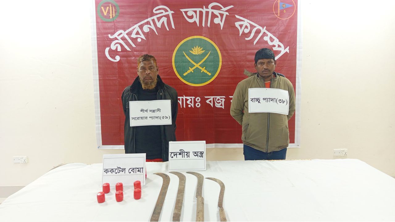 বরিশাল জেলার গৌরনদী উপজেলায় যৌথ বাহিনীর বিশেষ অভিযানে শীর্ষ সন্ত্রাসী সরোয়ার প্যাদাকে ককটেল ও দেশীয় অস্ত্রসহ আটক করা হয়েছে। বাংলাদেশ সেনাবাহিনীর ৭ পদাতিক ডিভিশনের আওতাধীন ৬ পদাতিক ব্রিগেডের ৬২ ইস্ট বেঙ্গল রেজিমেন্টের নেতৃত্বে শনিবার (০৮ ফেব্রুয়ারি ২০২৬) এ অভিযান পরিচালিত হয়।